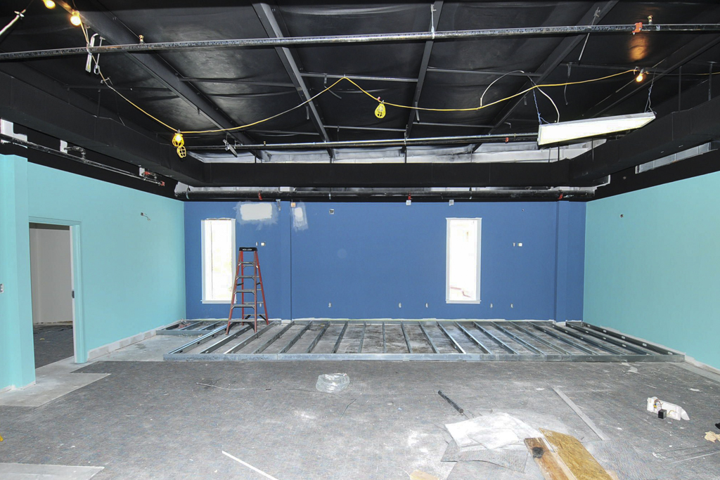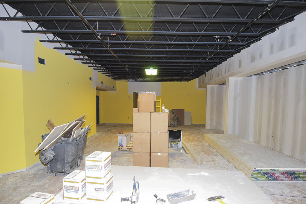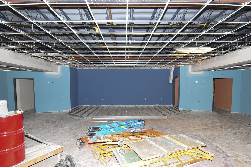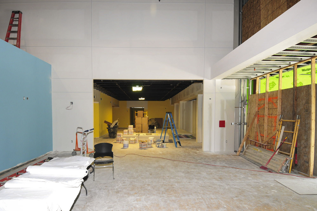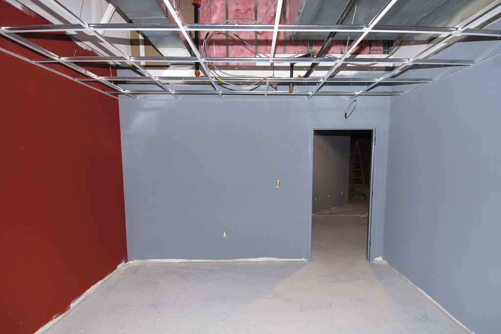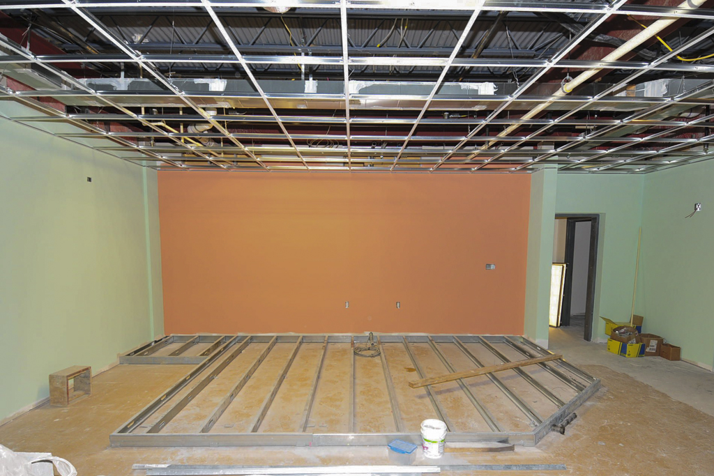All the interior walls are framed and the drywall has been installed. Fireproofing work is complete. The elevator has been installed. Framing for the platforms in individual ministry spaces is underway.