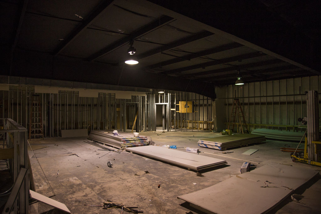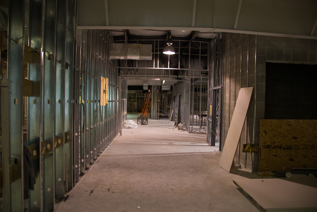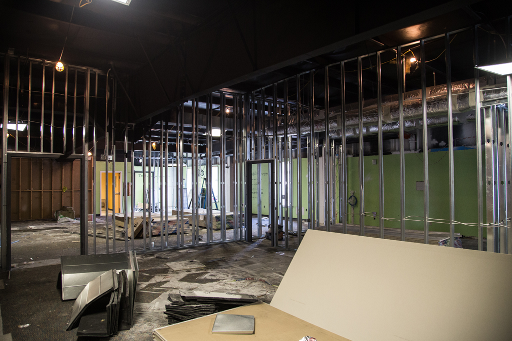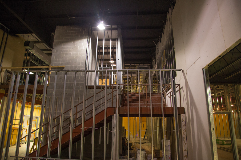 The structural steel framing for the new second floor is complete and the concrete floor slab is in place. We've started framing the new interior walls, and the stairs have been installed. Demolition for the plumbing rough-ins is complete.