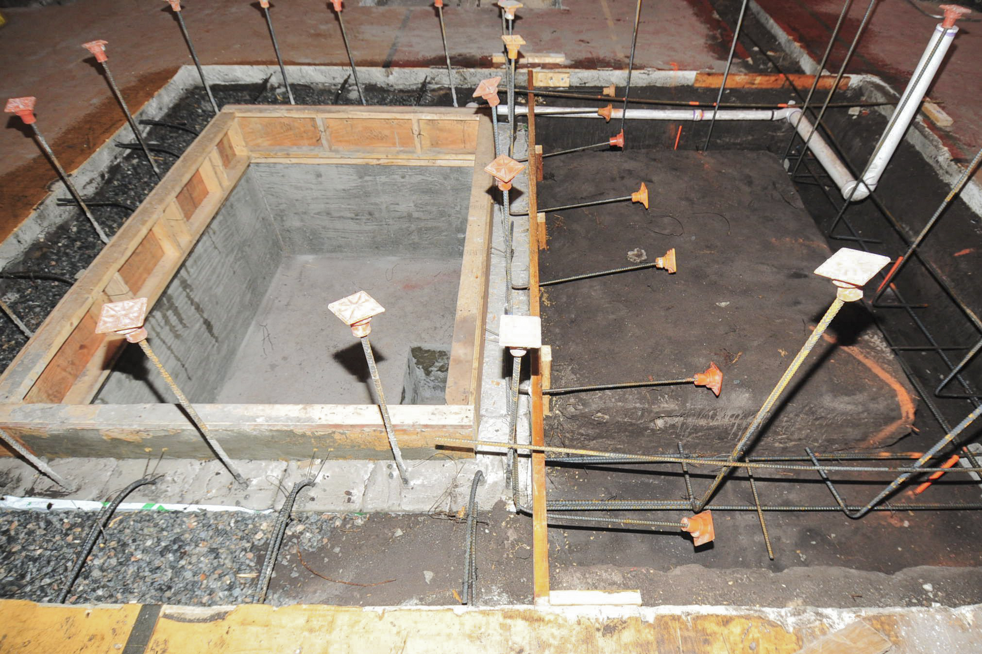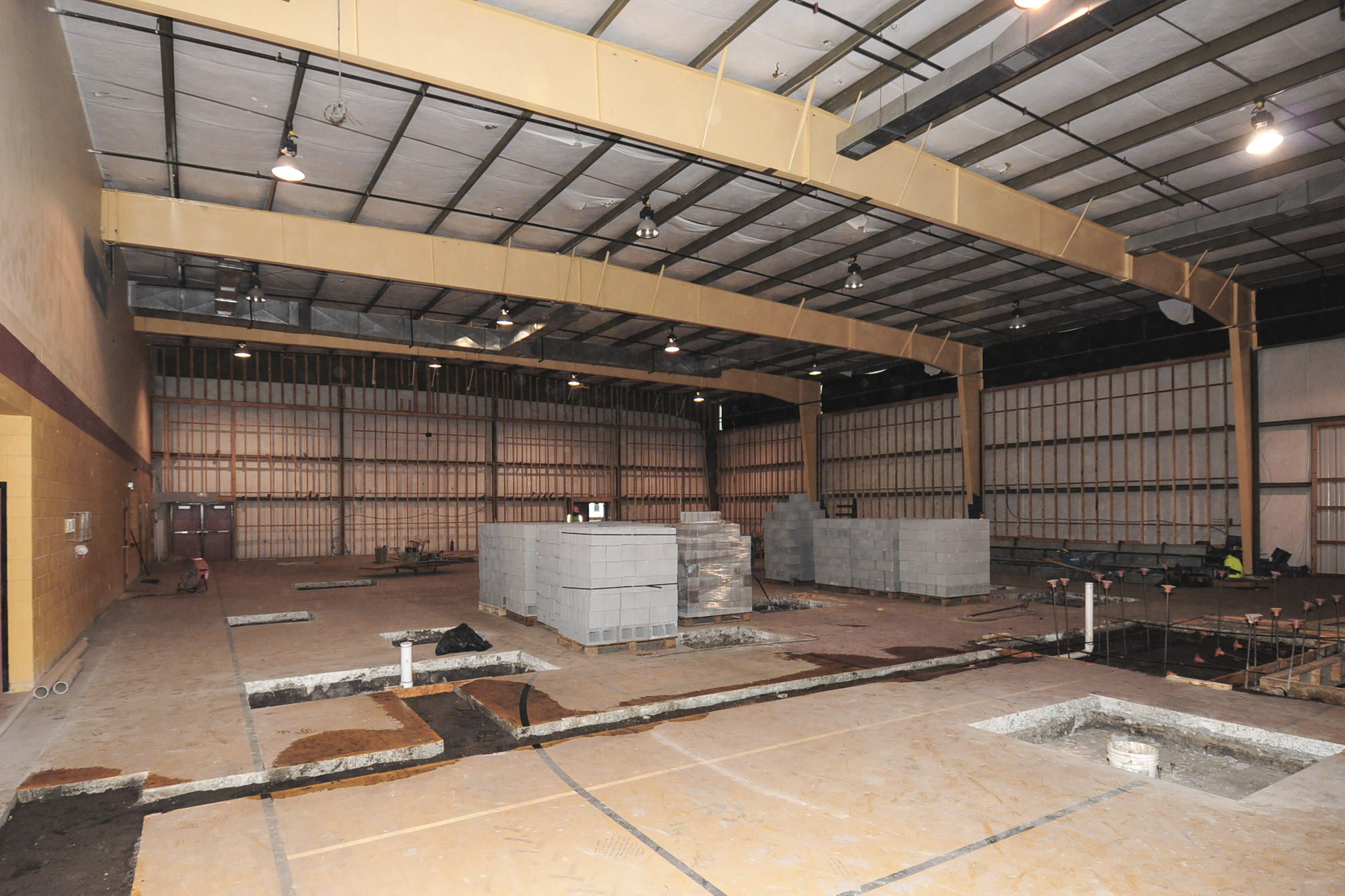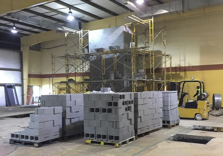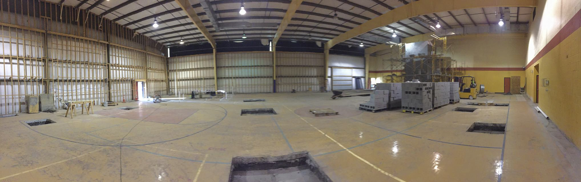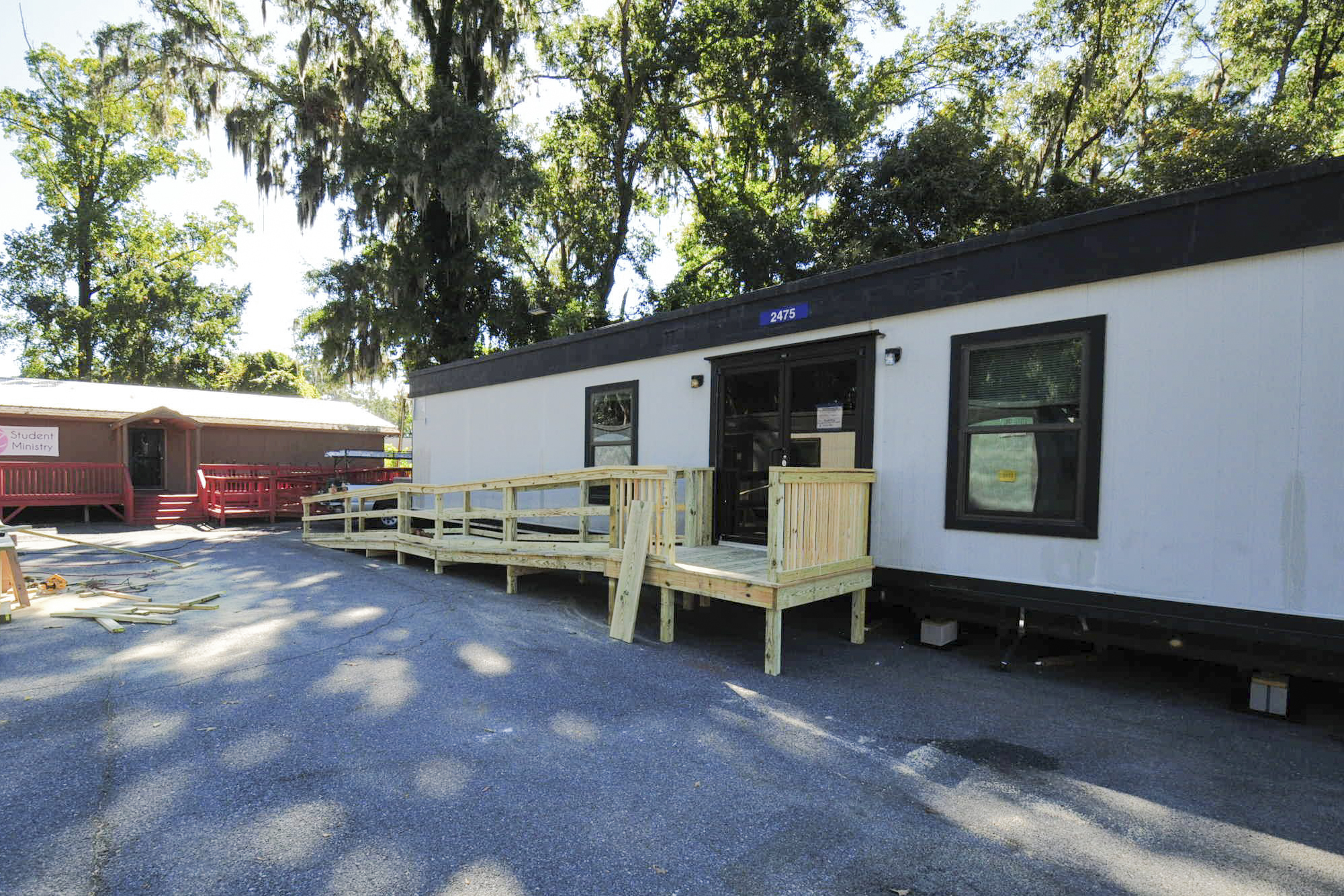 Concrete has been poured for the stairs and the second floor footers. The elevator shaft is under construction and plumbing is being installed. Modular units are on site to provide temporary children's ministry space for the duration of the construction project.