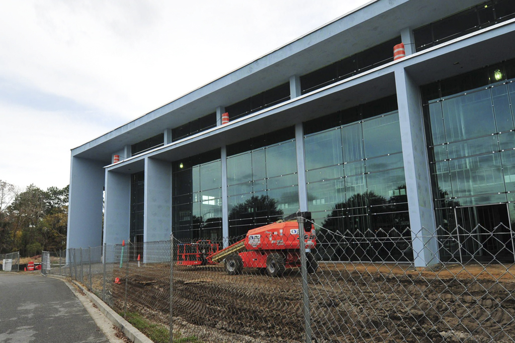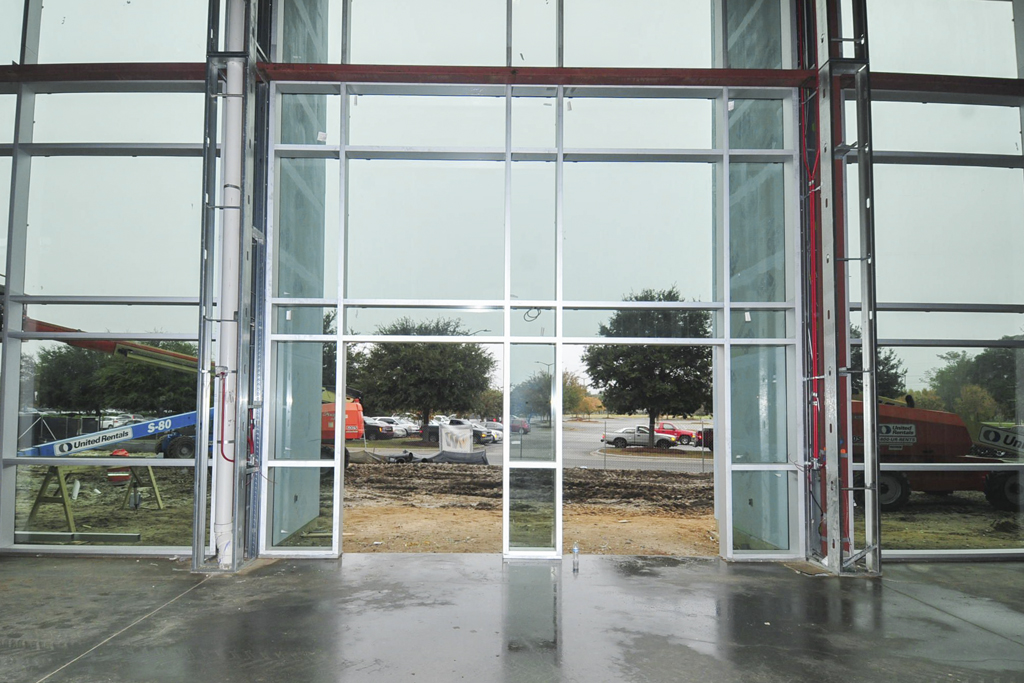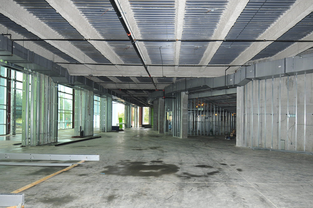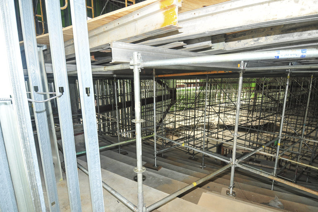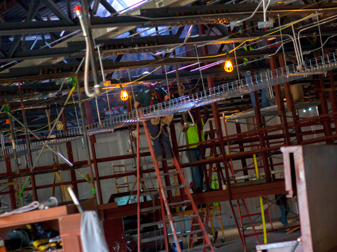 This month we have seen lots of progress in the abovbe-ceiling work. We are now running conduit for audio, video and lighting. Work has begun on the back of house metal and curtain wall framing. Glass is being put in along the front of the building.