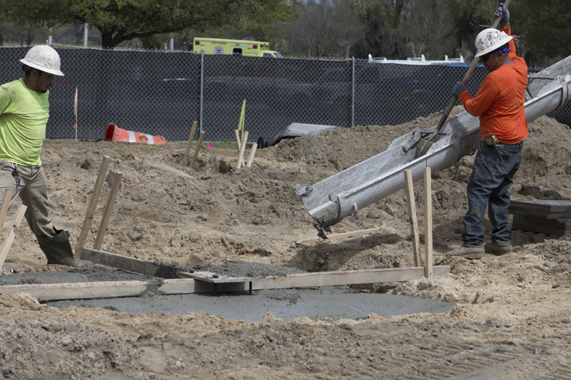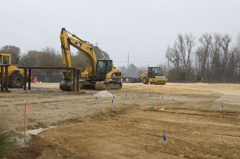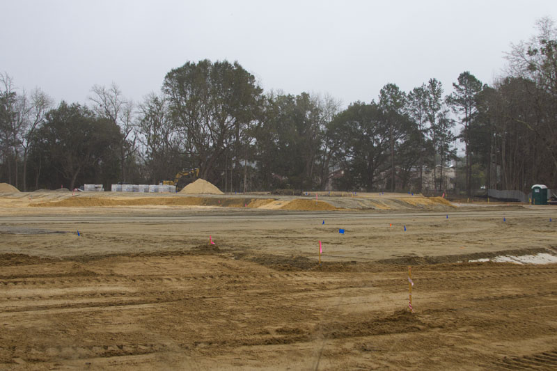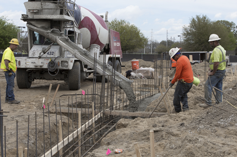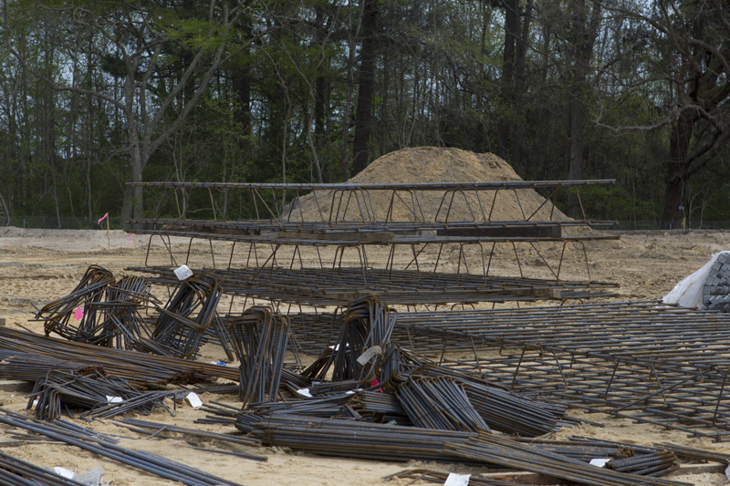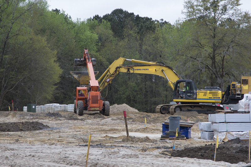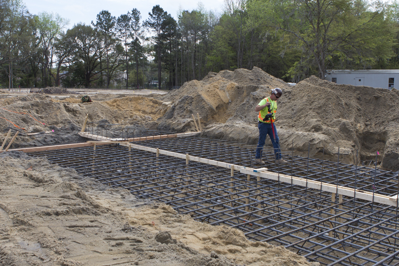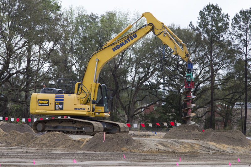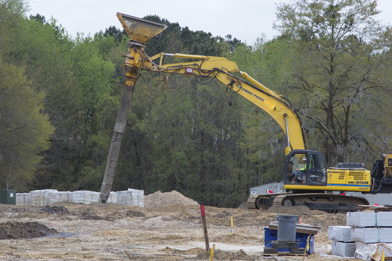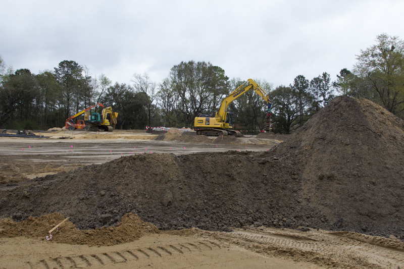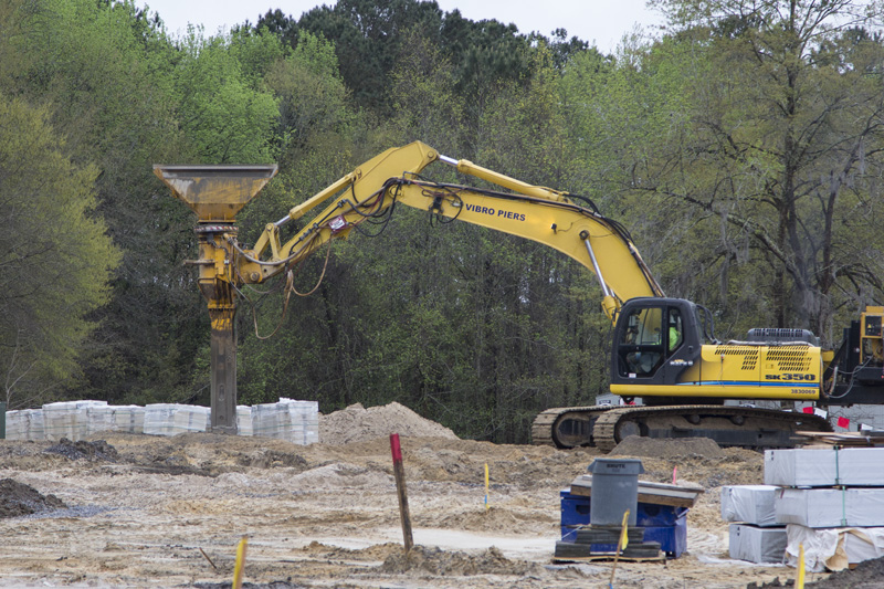 10,700 cubic feet of dirt was brought in to raise the level of the land by seven feet. Then work started on the installation of geo piers, part of the foundational structure, and concrete was poured to form the foundations of the structural columns.