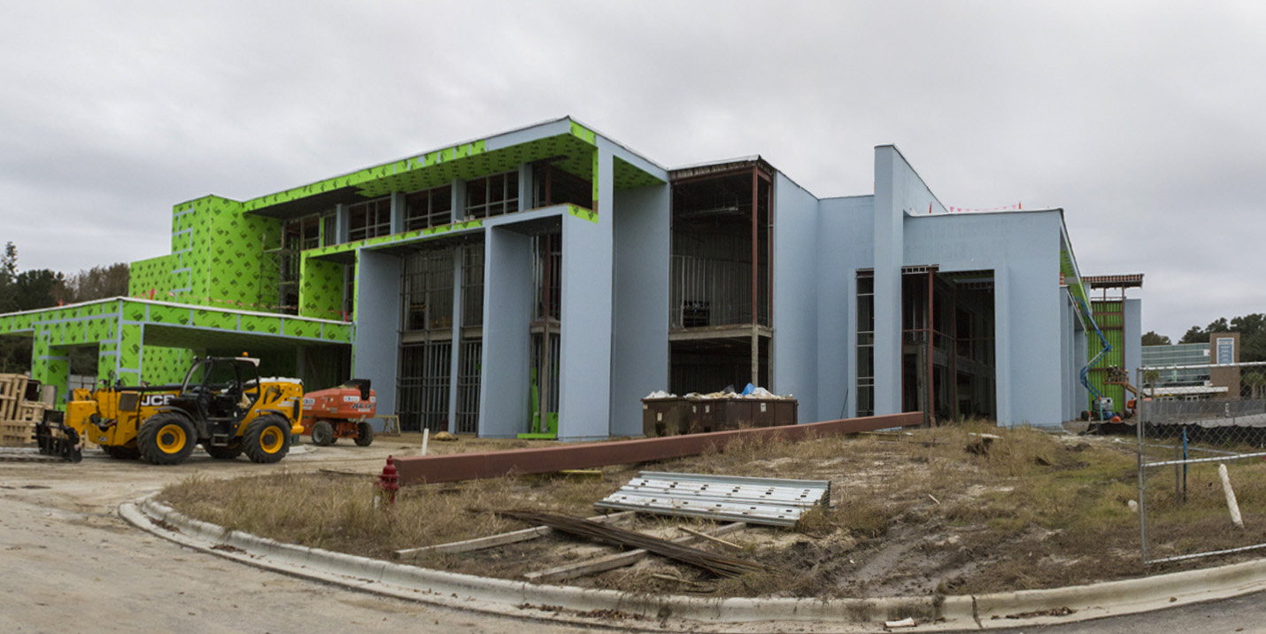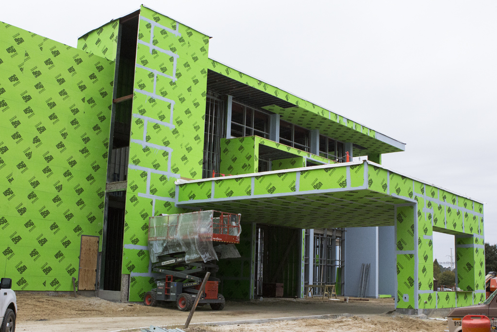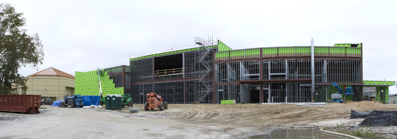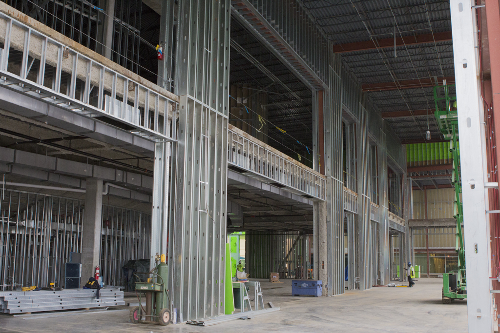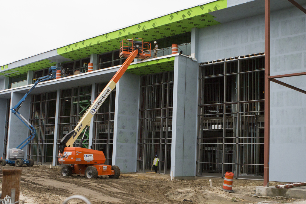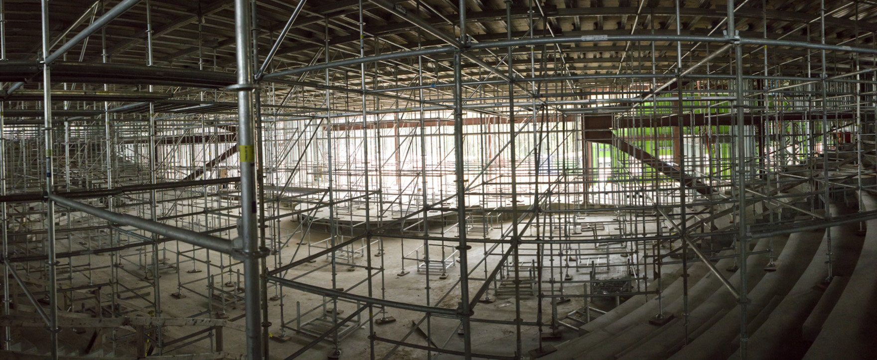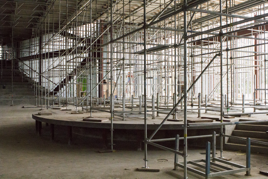 Scaffolding has been set up in the auditorium and the above-ceiling mechanical, electrical and plumbing work is in progress. The roofing should be complete by the end of the month. Framing for the walls and exterior windows continues all around the building.
