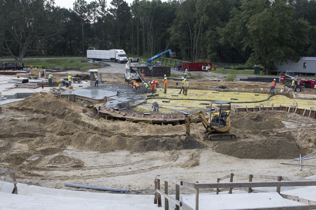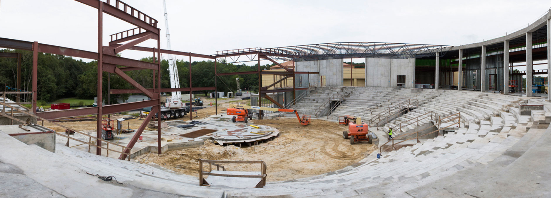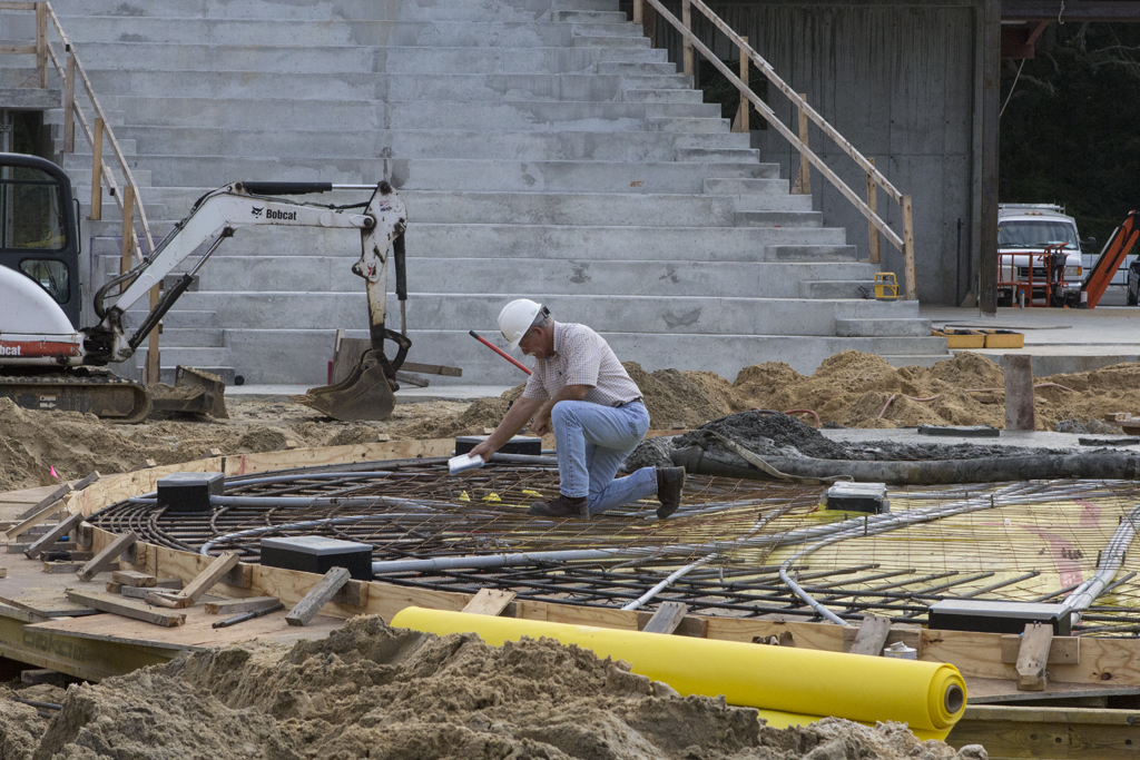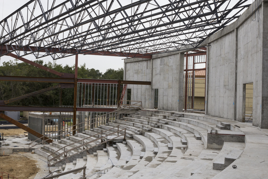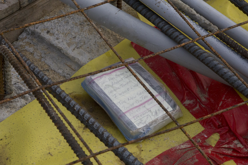 Concrete has been poured for the main platform area. In the place where the podium will stand, we placed a Bible donated by a church member that went round the world with him while he served with the military. Additional supports are being placed underneath the stadium seating, and the roof joists are being installed.