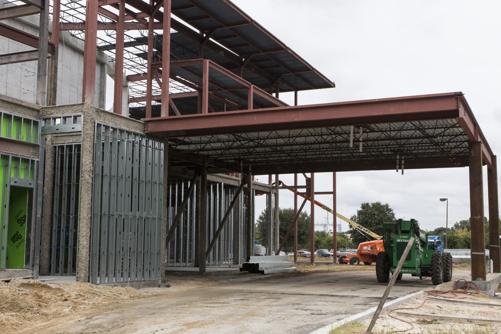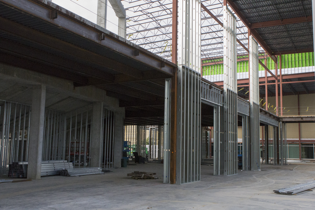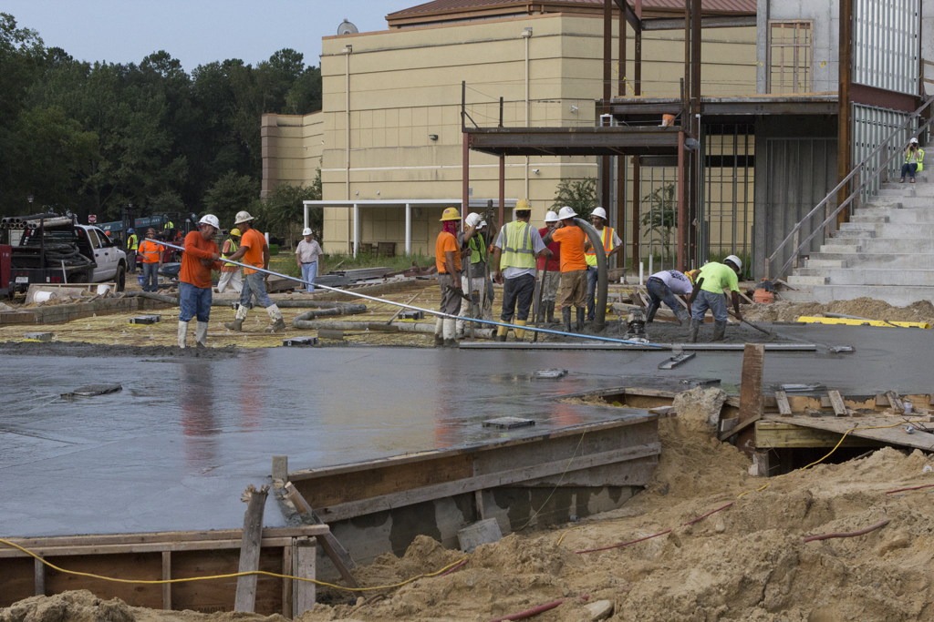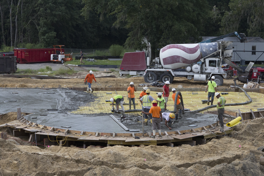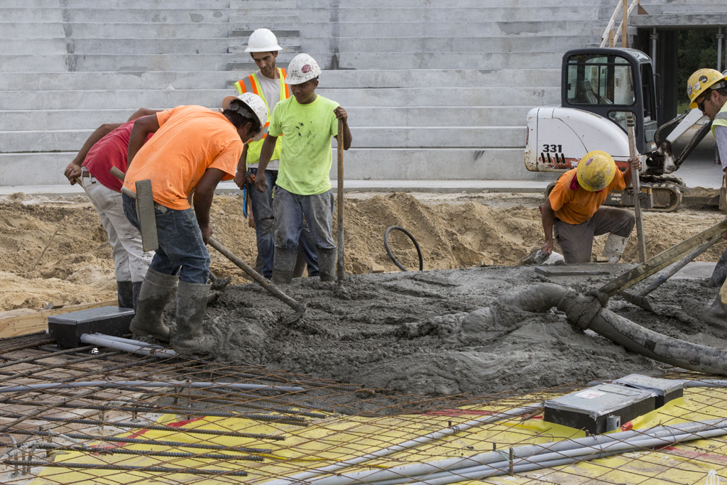 Concrete has been poured for the main platform area. In the place where the podium will stand, we placed a Bible donated by a church member that went round the world with him while he served with the military. Additional supports are being placed underneath the stadium seating, and the roof joists are being installed.