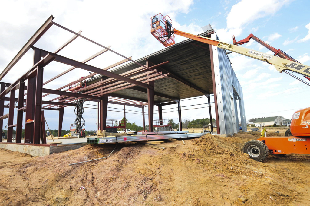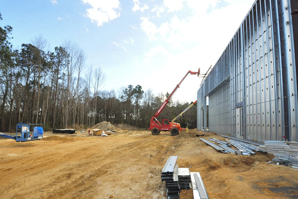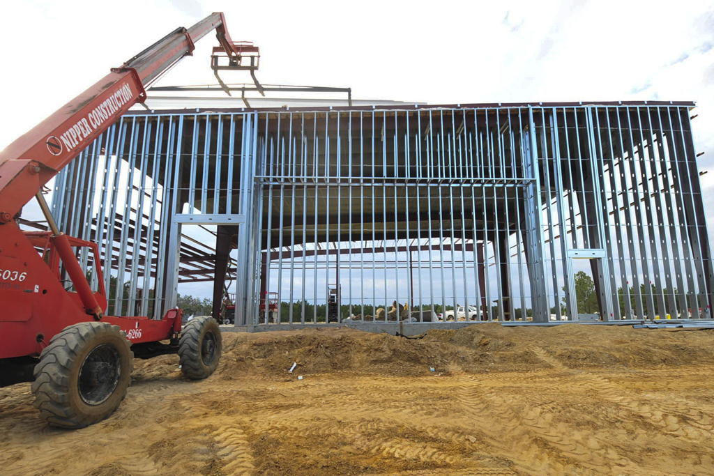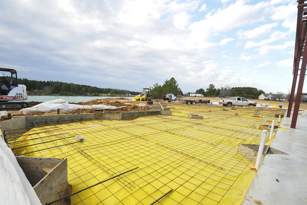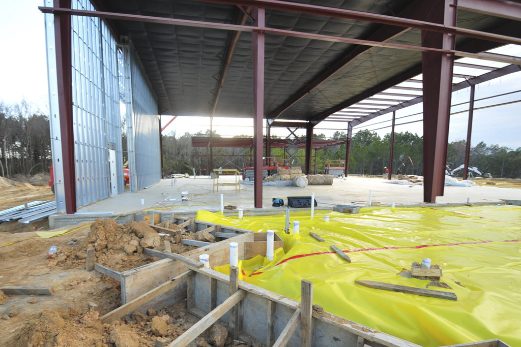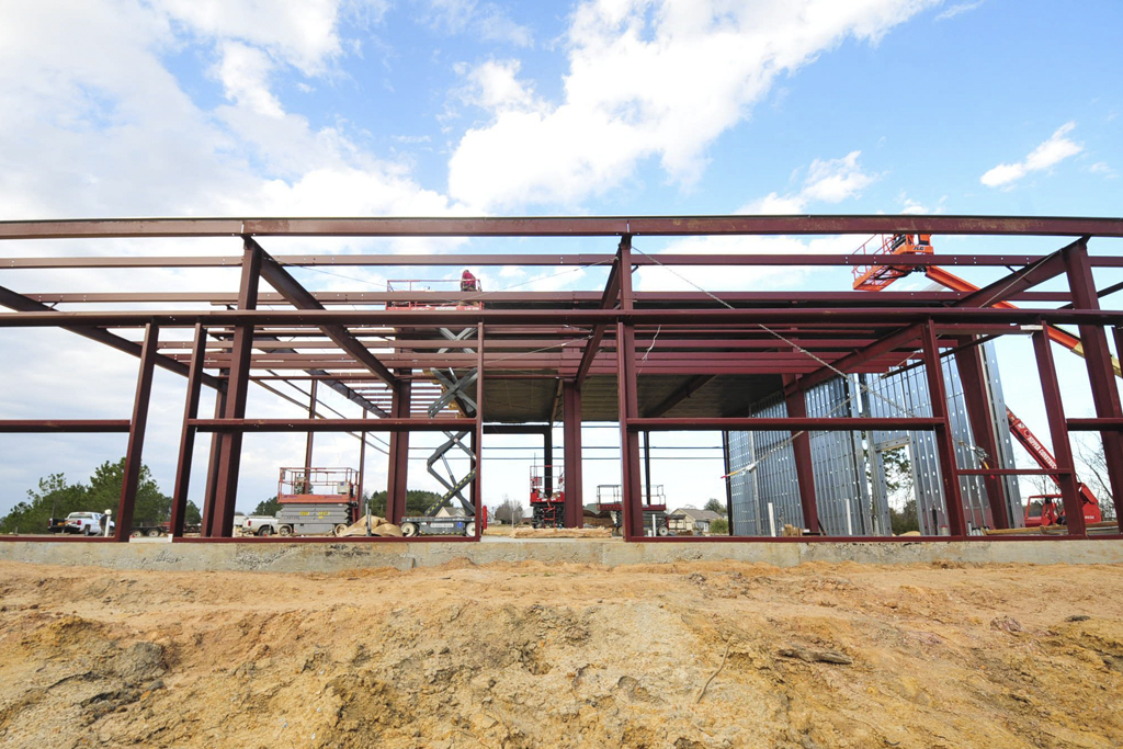 The final part of the concrete slab is being poured this month. The pre-engineered steel for the auditorium has been erected and the roofing installed. The office area pre-engineered steel is in place and sidewalls are being installed. Wall framing has started for the auditorium and office area. Erection of the structural steel for the lobby area will begin shortly.